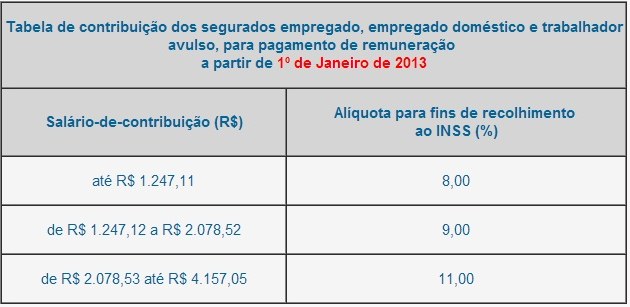 A Previdência Social divulgou a nova tabela de contribuição ao INSS para o ano de 2013. Essa tabela é válida para quem é empregado em empresa, empregado doméstico e trabalhadores avulsos. Os contribuintes individuais e facultativos devem escolher o valor que querem contribuir sendo que a contribuição mínima é sobre o valor R$ 678,00 e o teto previdenciário que é de R$ 4.157,05.